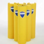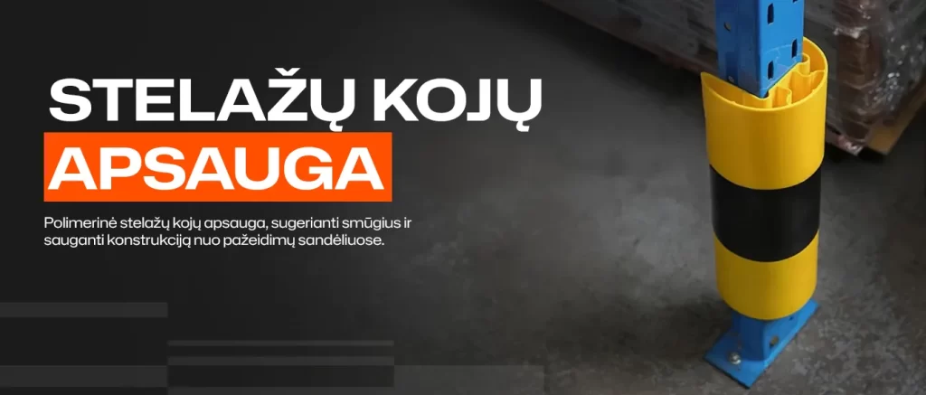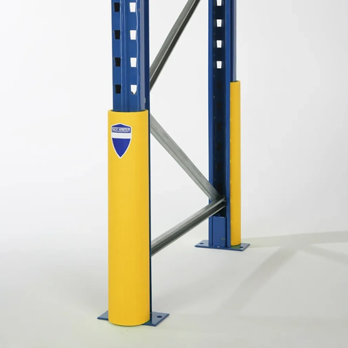Apsauga pagaminta iš balistinio plastiko. Išorinis korpusas nukreipia smūgio energiją aplink stelažo koją, o vidinis putų sluoksnis sugeria likusią energiją. Ši dviguba apsauga padeda išlaikyti stelažo konstrukcijos tvirtumą net ir intensyviai eksploatuojamose sandėlio zonose. Ji laikosi vietoje ir nenukrenta net atsitrenkus transporto priemonėms. Ryškios spalvos padeda aiškiai pažymėti saugias darbo ribas sandėlyje.