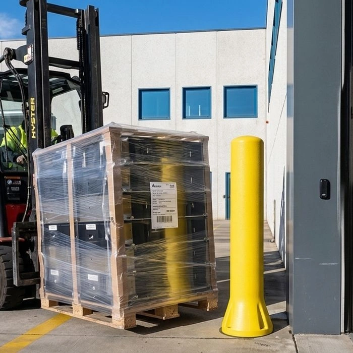 Sustiprintas apsauginis stulpelis intensyvioms sandėlio zonoms, efektyviai sugeriantis smūgius ir apsaugantis įrangą bei konstrukcijas.